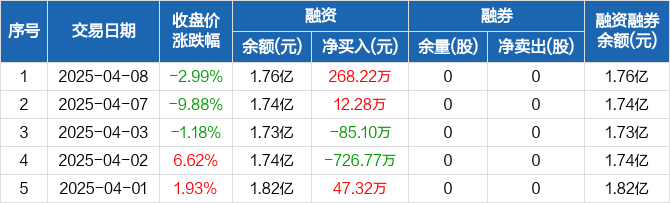 顺灏股份融资融券信息显示,2025年4月8日融资净买入268.22万元;融资余额1.76亿元,较前一日增加1.55%。