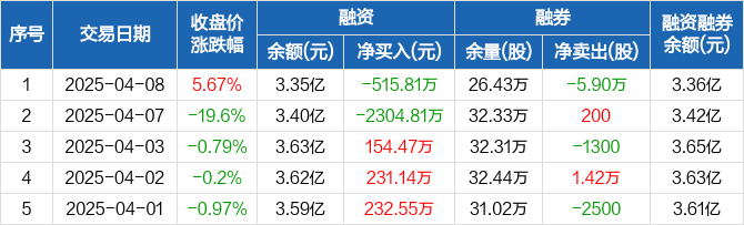 北信源融资融券信息显示,2025年4月8日融资净偿还515.81万元;融资余额3.35亿元,较前一日下降1.52%。