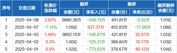 融资方面,当日融资买入819.11万元,融资偿还1468.25万元,融资净偿还649.13万元。融券方面,融券卖出12.97万份,融券偿还14.99万份,融券余量401.81万份,融券余额266万元。融资融券余额合计1.01亿元。
