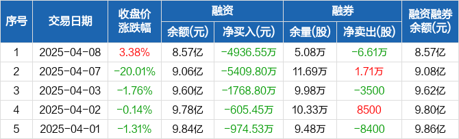融资方面,当日融资买入4765.74万元,融资偿还9702.29万元,融资净偿还4936.55万元,连续8日净偿还累计1.73亿元。融券方面,融券卖出3400股,融券偿还6.95万股,融券余量5.08万股,融券余额86.92万元。融资融券余额合计8.57亿元。