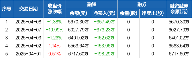融资方面,当日融资买入272.86万元,融资偿还630.35万元,融资净偿还357.49万元,连续7日净偿还累计2004.34万元。融券方面,融券卖出0股,融券偿还0股,融券余量0股,融券余额0元。融资融券余额合计5670.3万元。