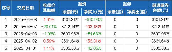 美新科技融资融券信息显示,2025年4月8日融资净偿还610.93万元;融资余额3101.21万元,较前一日下降16.46%。