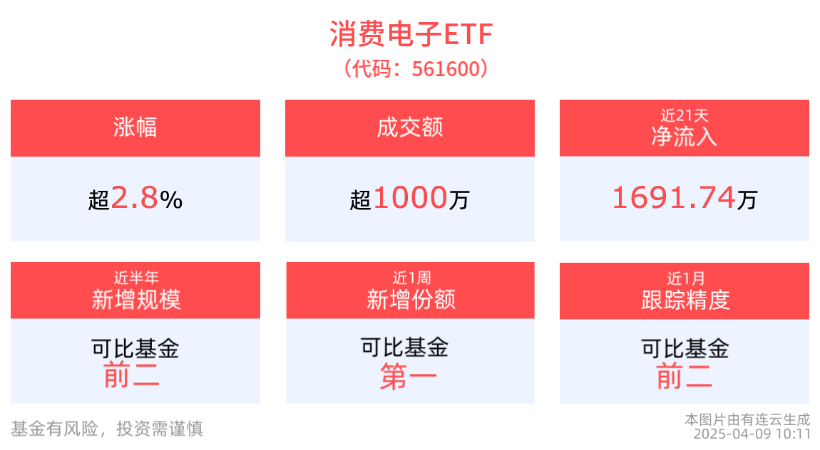 流动性方面,消费电子ETF盘中换手8.73%,成交1327.44万元。拉长时间看,截至4月8日,消费电子ETF近1周日均成交1579.74万元,排名可比基金前2。