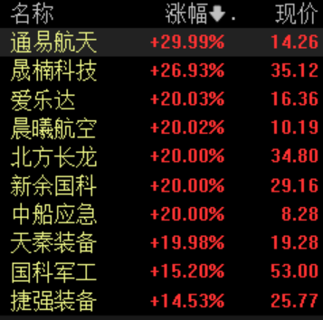 4月9日盘中,军工板块持续走强,截至发稿,通易航天30%涨停,晟楠科技涨超26%,爱乐达、晨曦航空、北方长龙等多股20%涨停。中兵红箭、长城军工等10余股涨停。
