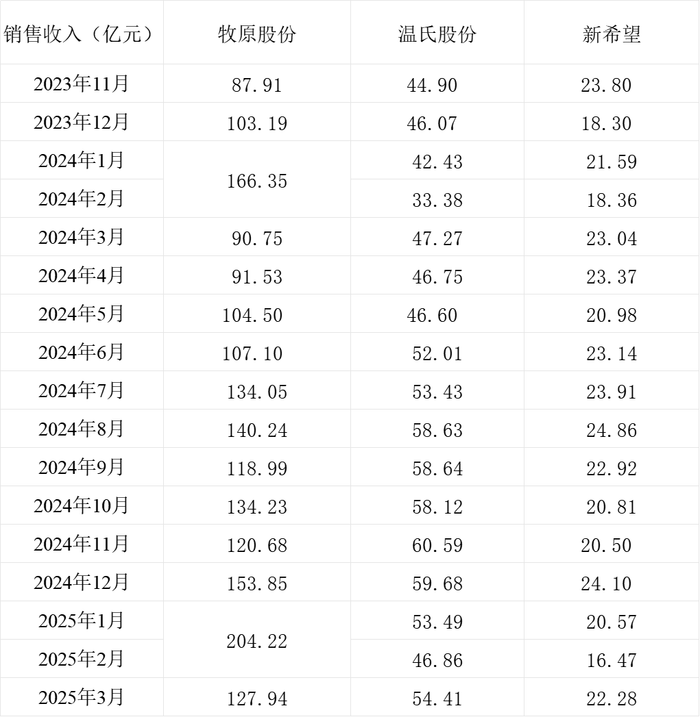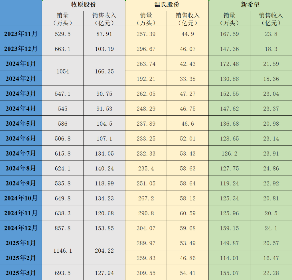 三大上市猪企牧原股份(002714.SZ)、新希望(000876.SZ)、温氏股份(300498.SZ)近日发布2025年3月生猪销售情况简报。