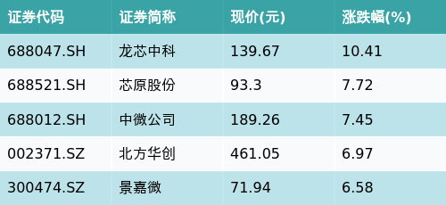 截至早盘收盘,国家大基金持股主题涨跌幅最高的五只股票为:龙芯中科(688047.SH)、芯原股份(688521.SH)、中微公司(688012.SH)、北方华创(002371.SZ)与景嘉微(300474.SZ)。详情见下表: