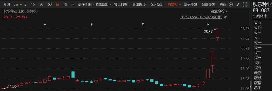种业股早间继续大涨,盘中最高一度飙升逾12%,创历史新高,本周仅3个交易日最大累计飙涨逾45%。秋乐种业再度触及30%涨停,此前已连续2日涨停,神农种业、万向德农等涨停或涨超10%。