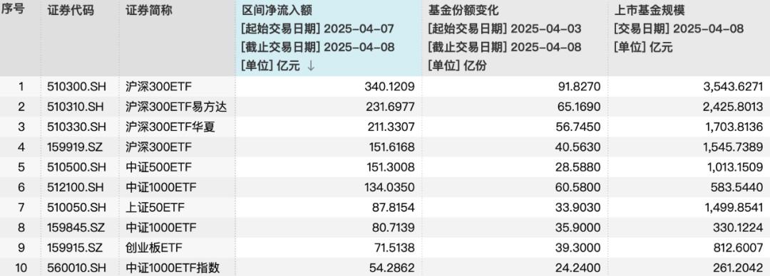 值得注意的是,全市场规模最大的ETF产品——沪深300ETF(510300)历史上首次出现连续两个交易日净流入超过160亿元的情况。4月7日至4月8日,该ETF累积净流入超340亿元,基金份额新增超90亿份,均位列全市场第一。