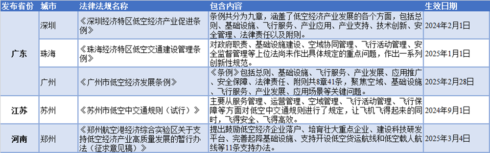 中央政策从产业方向、技术方向指出了发展的大方向。而地方政府结合自身区域资源禀赋和特点,出台更为具体的产业发展政策。2024年1月3日,全国首部低空经济地方法规于深圳出台。2024年7月18日,苏州市低空经济发展工作领导小组办公室发布了《苏州市低空空中交通规则(试行)》,作为全国首部地方性低空空中交通规则,于2024年9月1日起施行。