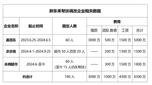 表格中写明,胖东来帮扶嘉百乐时借款3000万元,有60人参与帮扶,团队食宿和工资共有2000万元。帮扶步步高时,胖东来团队食宿和工资有1500万元。此外,胖东来从2024年6月至今,仍有15人帮扶永辉超市,其团队食宿和工资共计1800万元。胖东来称,无偿帮扶三家企业直接产生帮扶费用约8300万元。