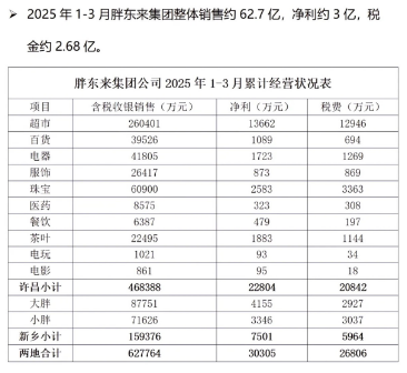 在回复中,胖东来还披露了2025年1至3月经营数据:集团整体销售额约62.78亿元,净利润3.03亿元。