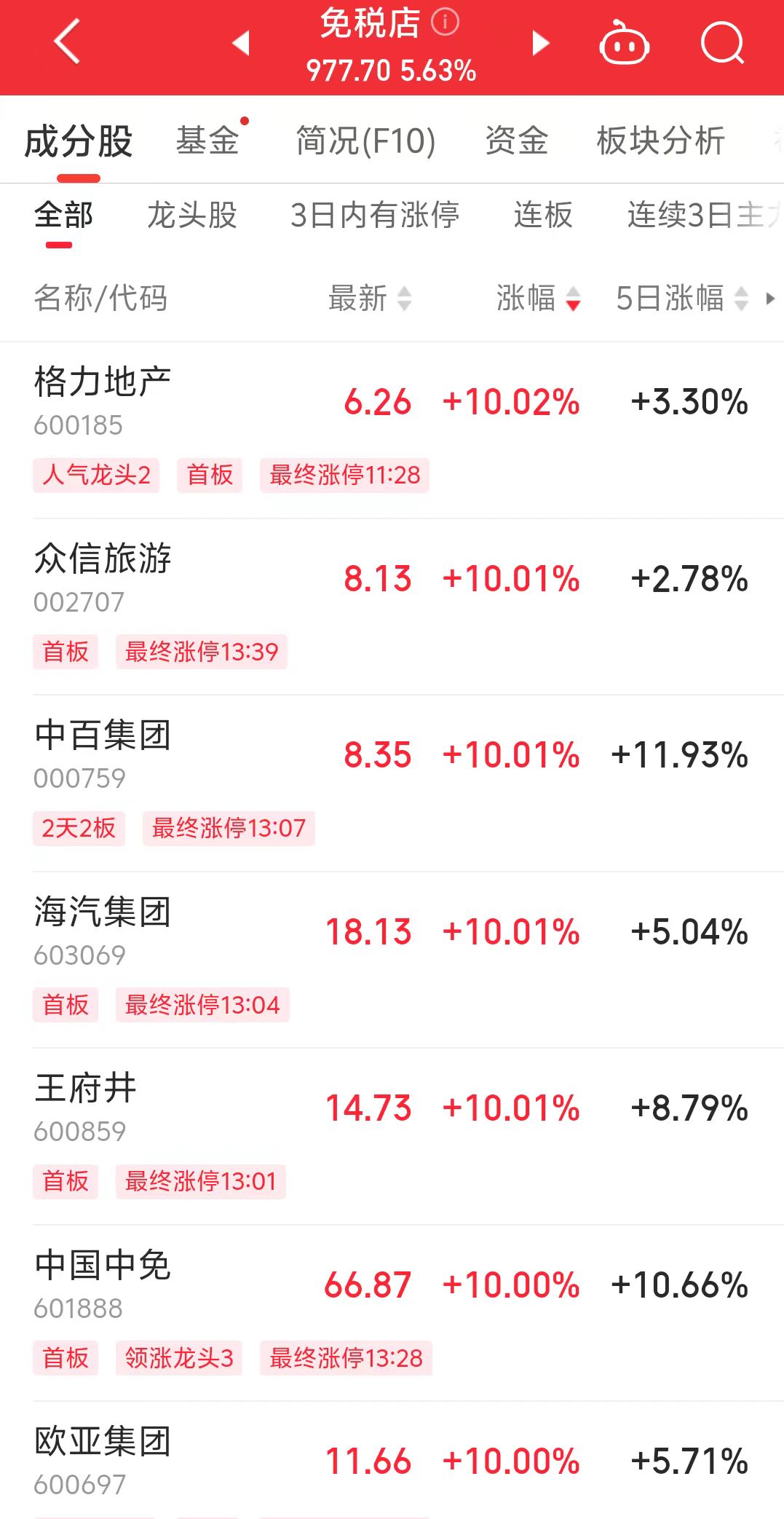 4月9日,免税概念股持续走高,王府井(600859.SH)涨停、格力地产(600185.SH)、欧亚集团(600697.SH)、众信旅游(002707.SZ)、中国中免(601888.SH)等多股涨停,武商集团(000501.SZ)、百联股份(600827.SH)等跟涨。