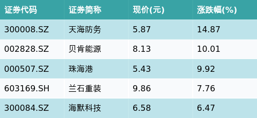 截至收盘,天然气主题涨跌幅最高的五只股票为:天海防务(300008.SZ)、贝肯能源(002828.SZ)、珠海港(000507.SZ)、兰石重装(603169.SH)与海默科技(300084.SZ)。详情见下表: