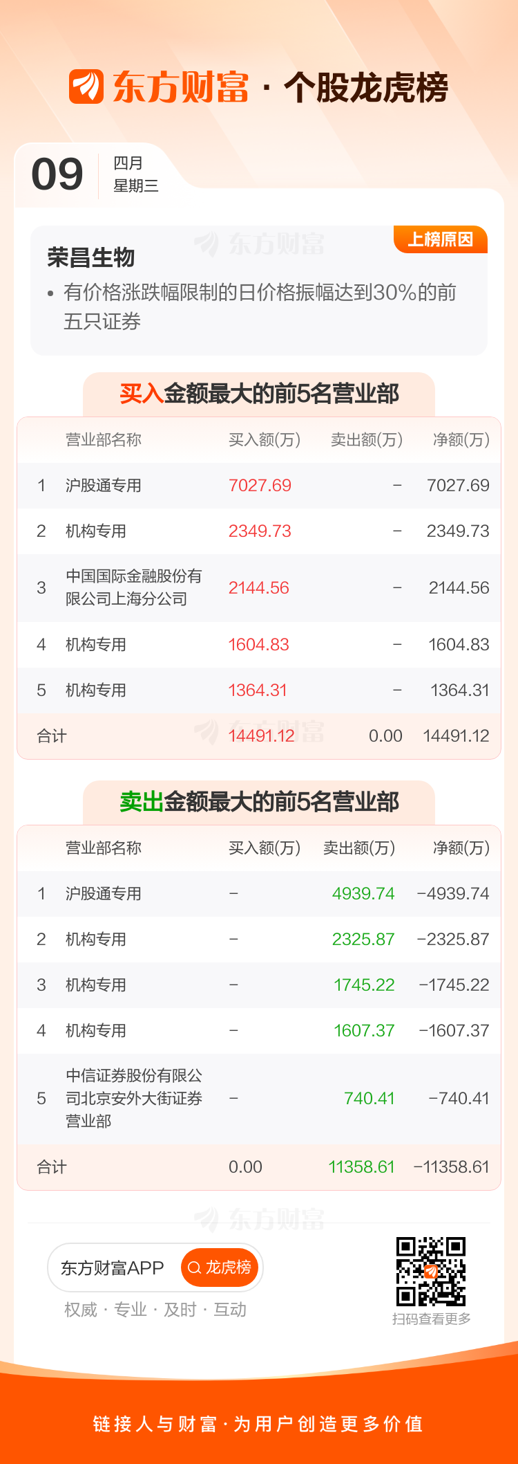 交易所2025年4月9日公布的交易公开信息显示,荣昌生物因成为有价格涨跌幅限制的日价格振幅达到30%的前五只证券上榜。荣昌生物当日收报44元,涨跌幅8.70%,偏离值34.98%,换手率6.44%,成交额4.21亿。