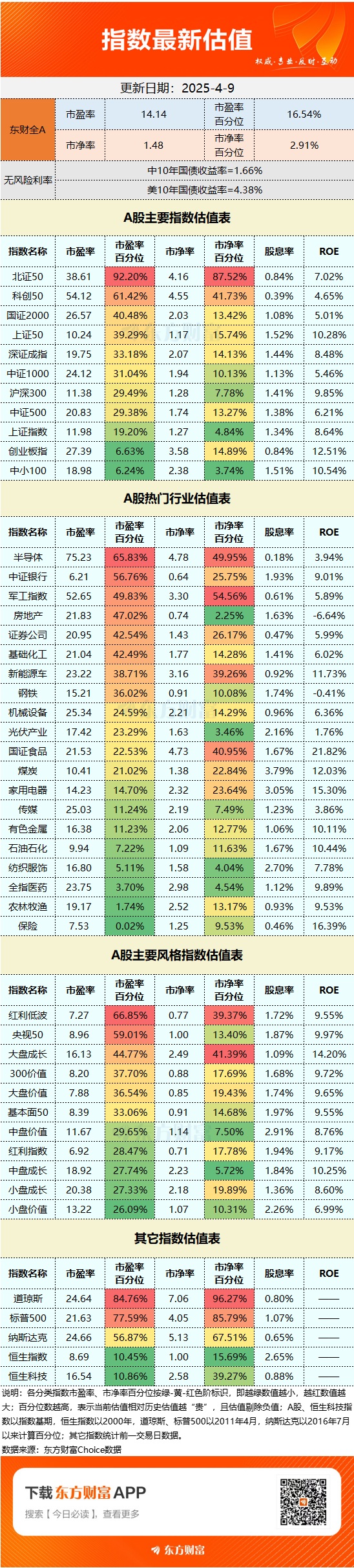 截至4月9日收盘,东方财富Choice数据显示,东财全A市盈率为14.14倍,市盈率百分位为16.54%;市净率为1.48倍,市净率百分位2.91%。