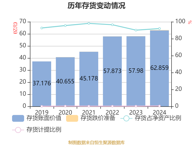 从存货变动来看,截至2024年末,公司存货账面价值为62.86亿元,占净资产的91.93%,较上年末增加4.88亿元。其中,存货跌价准备为2793.5万元,计提比例为0.44%。
