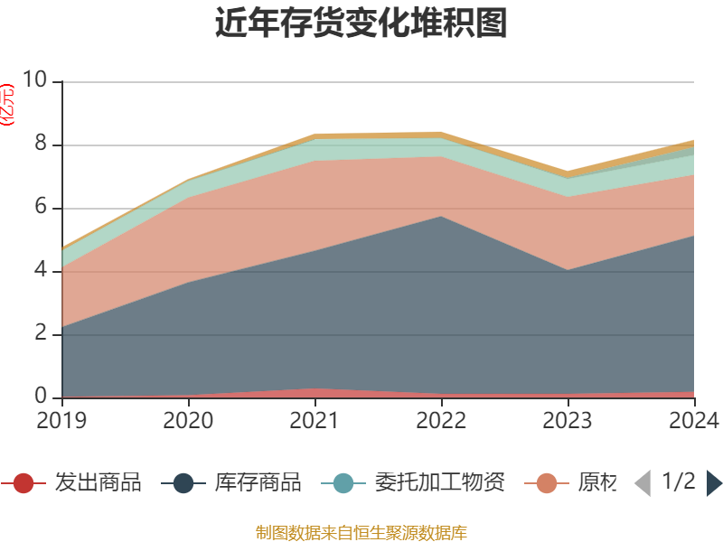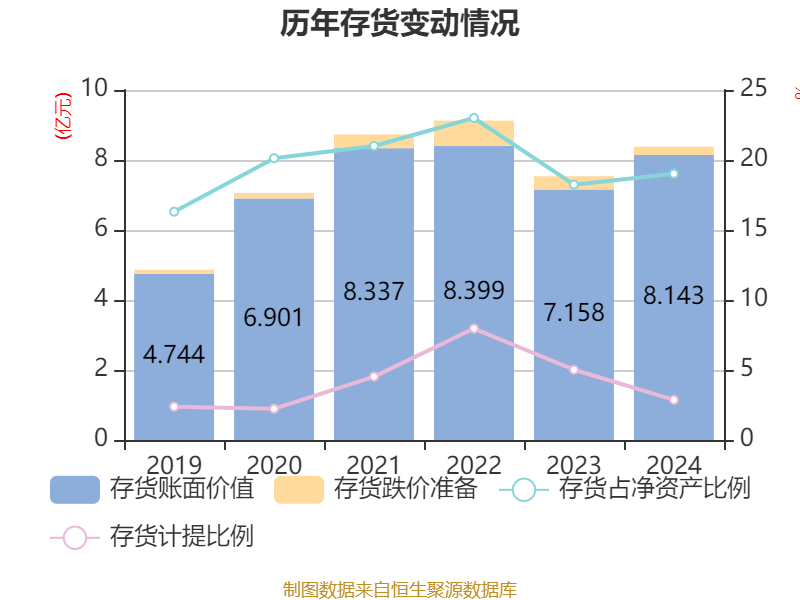 从存货变动来看,截至2024年末,公司存货账面价值为8.14亿元,占净资产的19.02%,较上年末增加9845.06万元。其中,存货跌价准备为2408.69万元,计提比例为2.87%。