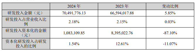 2024年全年,公司研发投入金额为7049.18万元,同比增长5.85%;研发投入占营业收入比例为2.18%,相比上年同期上升0.03个百分点。此外,公司全年研发投入资本化率为1.54%。