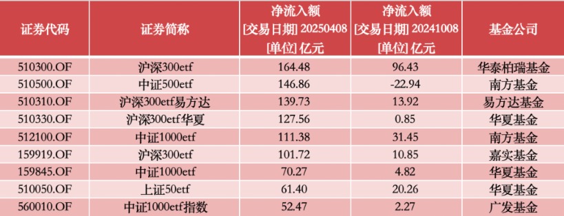 另从资金净流入情况来看,澎湃新闻记者据Wind数据统计,4月8日,全市场1129只可统计的股票型ETF(场内,非货币型,下同)资金净流入额合计为1117.80亿元,创历史新高,刷新2024年10月8日创造的1093.94亿元的净流入最高金额。
