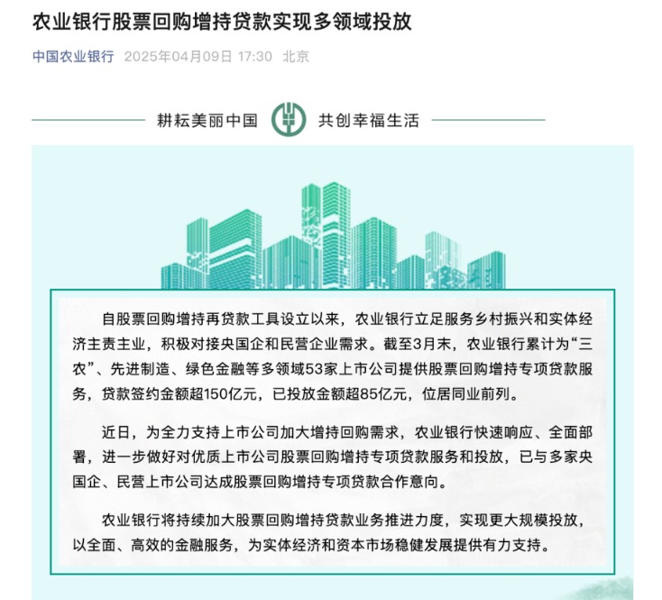 4月9日,农业银行表示,为全力支持上市公司加大增持回购需求,农业银行快速响应、全面部署,进一步做好对优质上市公司股票回购增持专项贷款服务和投放,已与多家央国企、民营上市公司达成股票回购增持专项贷款合作意向。