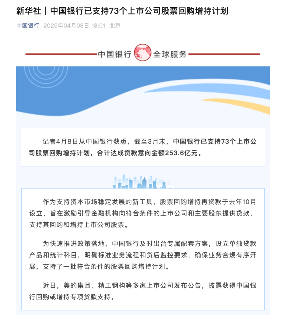4月8日,中国银行表示,为快速推进政策落地,中国银行及时出台专属配套方案,设立单独贷款产品和统计科目,明确标准业务流程和贷后监控要求,确保业务合规有序开展,支持了一批符合条件的股票回购增持计划。