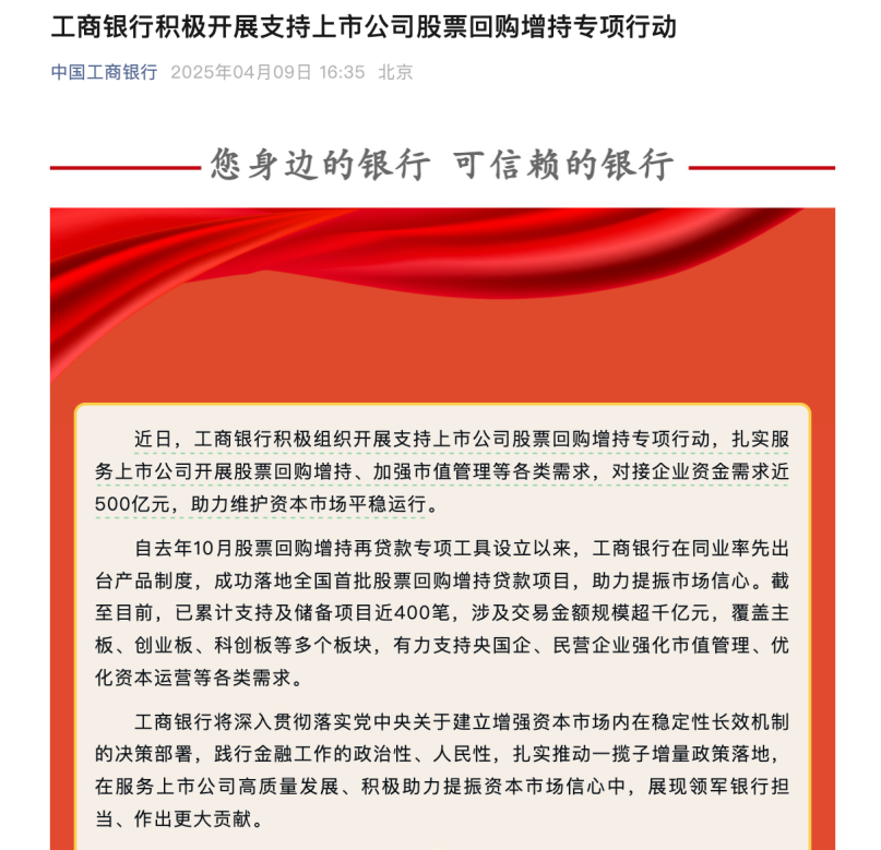 4月9日,工商银行表示,近日,该行积极组织开展支持上市公司股票回购增持专项行动,扎实服务上市公司开展股票回购增持、加强市值管理等各类需求,对接企业资金需求近500亿元,助力维护资本市场平稳运行。