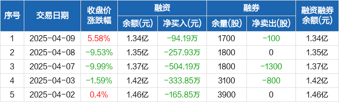瑞斯康达融资融券信息显示,2025年4月9日融资净偿还94.19万元;融资余额1.34亿元,较前一日下降0.7%。