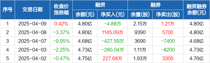 融资方面,当日融资买入2630.25万元,融资偿还2635.12万元,融资净偿还4.88万元。融券方面,融券卖出1.48万股,融券偿还2700股,融券余量2.15万股,融券余额15.47万元。融资融券余额合计4.8亿元。