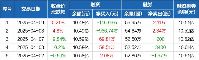 融资方面,当日融资买入558.86万元,融资偿还705.79万元,融资净偿还146.93万元。融券方面,融券卖出3.86万股,融券偿还1.75万股,融券余量56.95万股,融券余额273.91万元。融资融券余额合计10.51亿元。