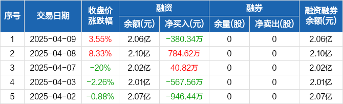 融资方面,当日融资买入1377.77万元,融资偿还1758.11万元,融资净偿还380.34万元。融券方面,融券卖出0股,融券偿还0股,融券余量0股,融券余额0元。融资融券余额合计2.06亿元。