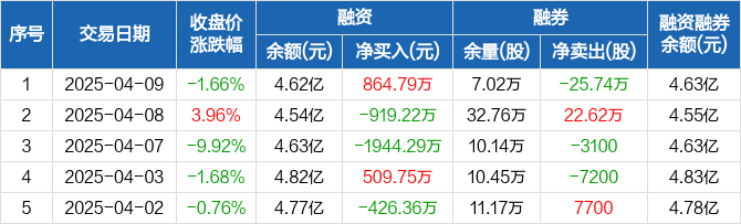 融资方面,当日融资买入2680.1万元,融资偿还1815.31万元,融资净买入864.79万元。融券方面,融券卖出1.76万股,融券偿还27.5万股,融券余量7.02万股,融券余额41.7万元。融资融券余额合计4.63亿元。