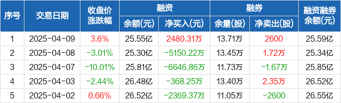 融资方面,当日融资买入1.53亿元,融资偿还1.28亿元,融资净买入2480.31万元。融券方面,融券卖出3.71万股,融券偿还3.45万股,融券余量13.71万股,融券余额426.11万元。融资融券余额合计25.59亿元。