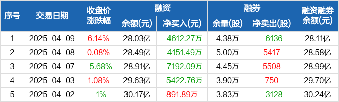 中微公司融资融券信息显示,2025年4月9日融资净偿还4612.27万元;融资余额28.03亿元,较前一日下降1.62%。