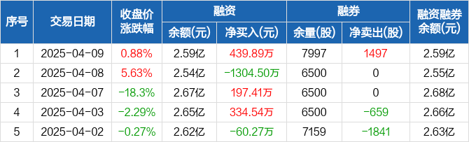 融资方面,当日融资买入1452.86万元,融资偿还1012.97万元,融资净买入439.89万元。融券方面,融券卖出2297股,融券偿还800股,融券余量7997股,融券余额42.2万元。融资融券余额合计2.59亿元。