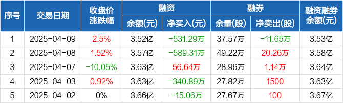 融资方面,当日融资买入630.53万元,融资偿还1161.82万元,融资净偿还531.29万元。融券方面,融券卖出1.96万股,融券偿还13.61万股,融券余量37.57万股,融券余额77.02万元。融资融券余额合计3.53亿元。
