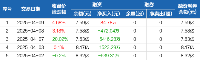 融资方面,当日融资买入5447.38万元,融资偿还5362.6万元,融资净买入84.78万元。融券方面,融券卖出0股,融券偿还0股,融券余量0股,融券余额0元。融资融券余额合计7.59亿元。