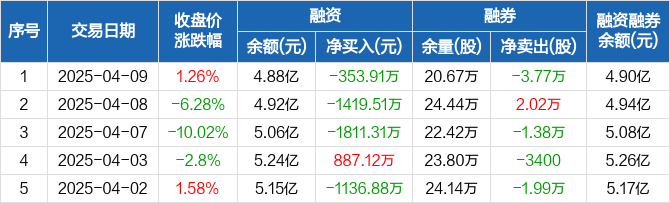 融资方面,当日融资买入4983.15万元,融资偿还5337.06万元,融资净偿还353.91万元,连续3日净偿还累计3584.73万元。融券方面,融券卖出1.46万股,融券偿还5.23万股,融券余量20.67万股,融券余额165.57万元。融资融券余额合计4.9亿元。