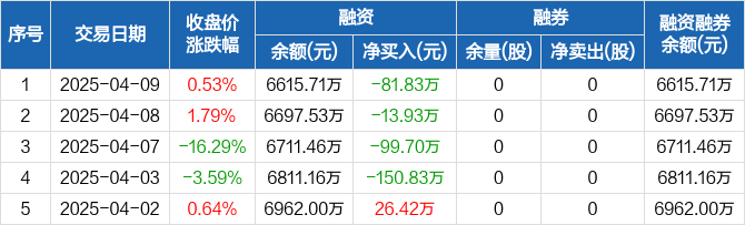 融资方面,当日融资买入407.92万元,融资偿还489.75万元,融资净偿还81.83万元,连续4日净偿还累计346.29万元。融券方面,融券卖出0股,融券偿还0股,融券余量0股,融券余额0元。融资融券余额合计6615.71万元。