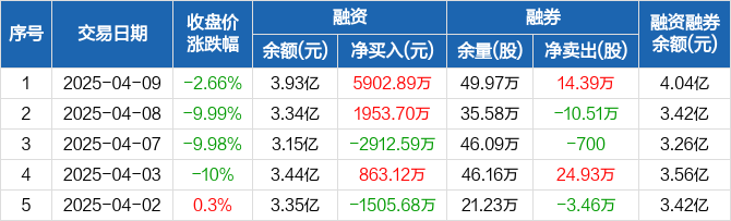 融资方面,当日融资买入1.2亿元,融资偿还6095.92万元,融资净买入5902.89万元。融券方面,融券卖出15.6万股,融券偿还1.21万股,融券余量49.97万股,融券余额1077.89万元。融资融券余额合计4.04亿元。