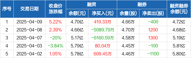 融资方面,当日融资买入5530.32万元,融资偿还5110.99万元,融资净买入419.33万元。融券方面,融券卖出0股,融券偿还400股,融券余量4.66万股,融券余额212.31万元。融资融券余额合计4.72亿元。