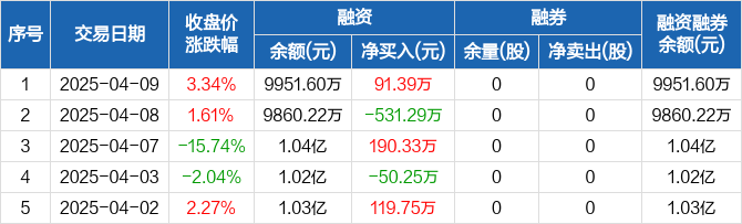 融资方面,当日融资买入380.17万元,融资偿还288.79万元,融资净买入91.39万元。融券方面,融券卖出0股,融券偿还0股,融券余量0股,融券余额0元。融资融券余额合计9951.6万元。