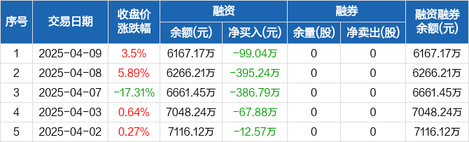 融资方面,当日融资买入573.44万元,融资偿还672.49万元,融资净偿还99.04万元,连续5日净偿还累计961.52万元。融券方面,融券卖出0股,融券偿还0股,融券余量0股,融券余额0元。融资融券余额合计6167.17万元。