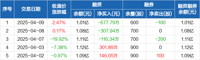融资方面,当日融资买入552.98万元,融资偿还1230.77万元,融资净偿还677.79万元,连续3日净偿还累计1102.07万元。融券方面,融券卖出0股,融券偿还100股,融券余量600股,融券余额2.47万元。融资融券余额合计1.01亿元。
