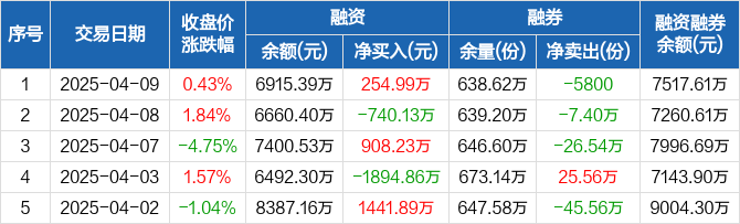融资方面,当日融资买入2402.44万元,融资偿还2147.44万元,融资净买入254.99万元。融券方面,融券卖出0份,融券偿还5800份,融券余量638.62万份,融券余额602.21万元。融资融券余额合计7517.61万元。
