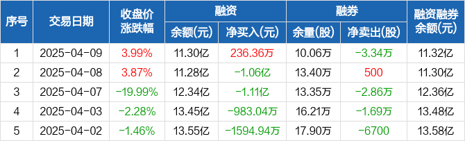 融资方面,当日融资买入1.33亿元,融资偿还1.31亿元,融资净买入236.36万元。融券方面,融券卖出1.06万股,融券偿还4.4万股,融券余量10.06万股,融券余额160.05万元。融资融券余额合计11.32亿元。