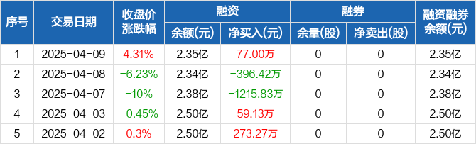 融资方面,当日融资买入1445.74万元,融资偿还1368.74万元,融资净买入77万元。融券方面,融券卖出0股,融券偿还0股,融券余量0股,融券余额0元。融资融券余额合计2.35亿元。