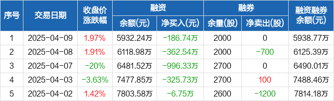融资方面,当日融资买入280.9万元,融资偿还467.64万元,融资净偿还186.74万元,连续5日净偿还累计1878.09万元。融券方面,融券卖出0股,融券偿还0股,融券余量2000股,融券余额6.53万元。融资融券余额合计5938.77万元。