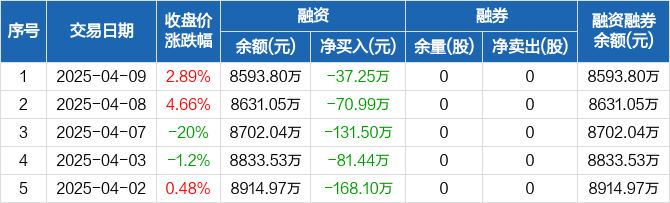 融资方面,当日融资买入355.43万元,融资偿还392.67万元,融资净偿还37.25万元,连续7日净偿还累计1205.38万元。融券方面,融券卖出0股,融券偿还0股,融券余量0股,融券余额0元。融资融券余额合计8593.8万元。