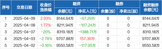 融资方面,当日融资买入716.05万元,融资偿还783.34万元,融资净偿还67.29万元,连续3日净偿还累计1563.24万元。融券方面,融券卖出0股,融券偿还0股,融券余量0股,融券余额0元。融资融券余额合计8144.64万元。