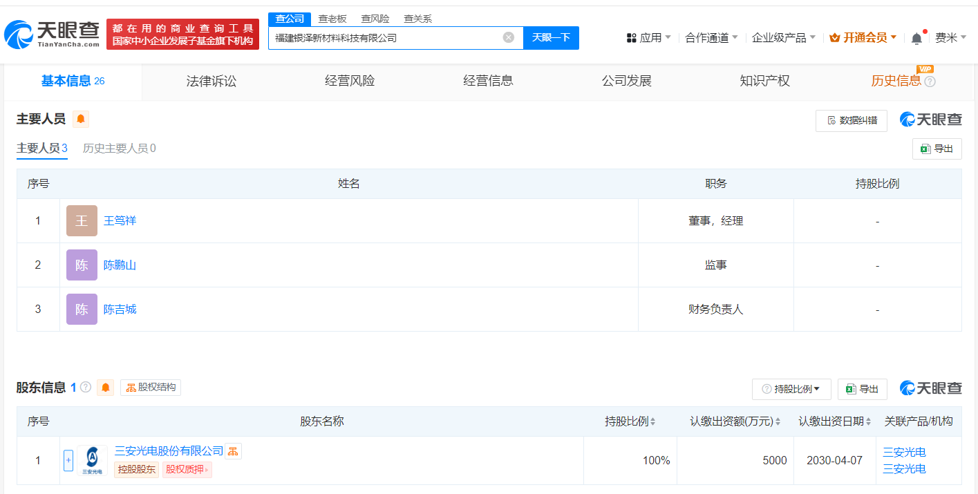 南方财经4月10日电,天眼查App显示,福建银泽新材料科技有限公司成立,法定代表人为王笃祥,注册资本5000万人民币,经营范围包括科技推广和应用服务、生产性废旧金属回收、贵金属冶炼、金属材料销售、有色金属合金销售、金属链条及其他金属制品销售等,由三安光电(600703)全资持股。